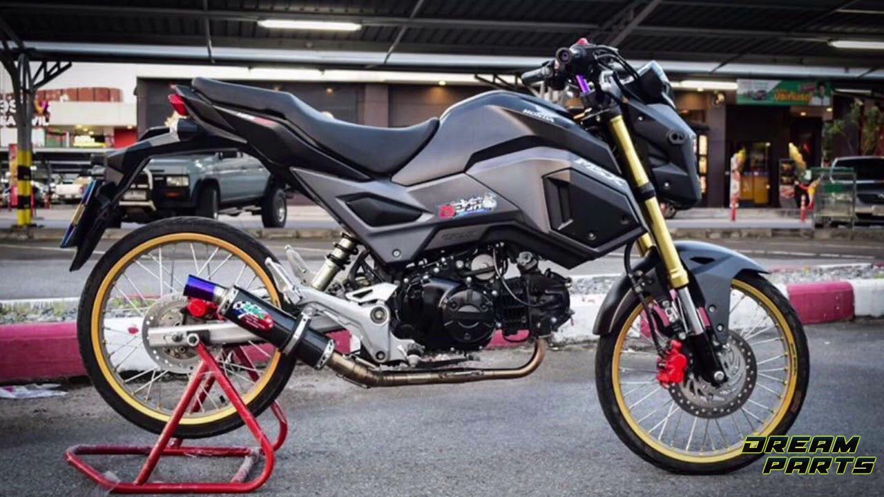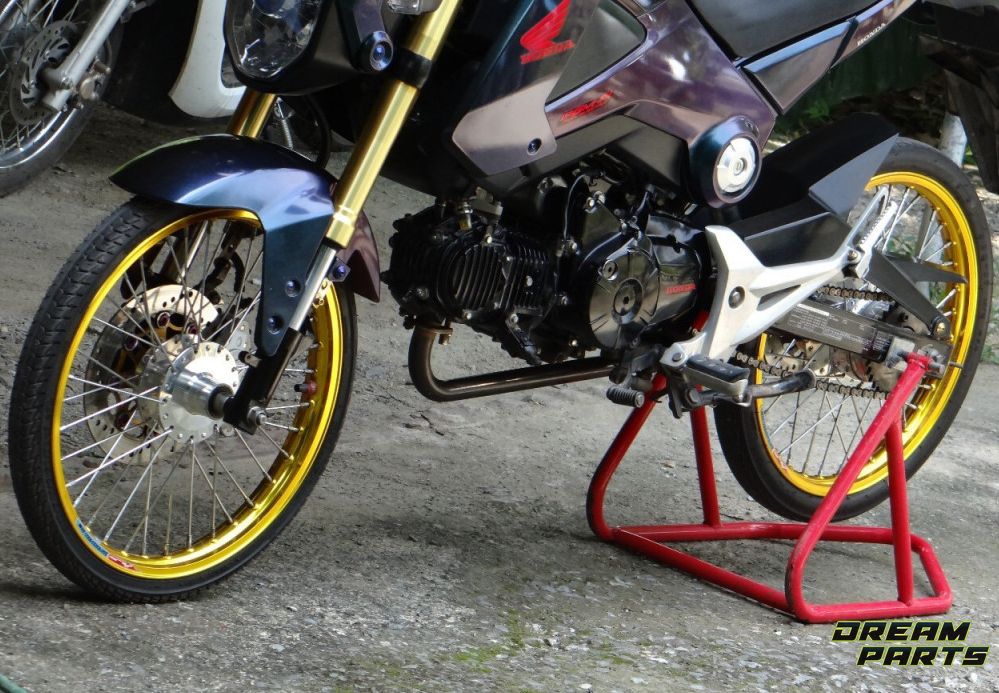 Kit de conversion de jantes à rayons 1,4 x 17” pour Honda MSX 125. Moyeux d’origine Honda, jantes Yoko.